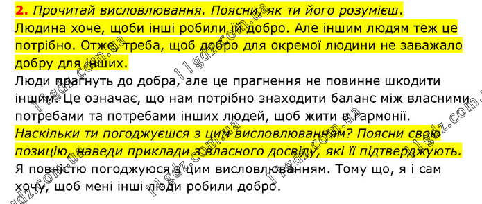 2. Прочитай висловлювання. Поясни, як ти його розумієш. Людина хоче, щоби інші робили їй добро. Але іншим людям теж це потрібно. Отже, треба, щоб добро для окремої людини не заважало добру для інших. Люди прагнуть до добра, але це прагнення не повинне шкодити іншим. Це означає, що нам потрібно знаходити баланс між власними потребами та потребами інших людей, щоб жити в гармонії. Наскільки ти погоджуєшся з цим висловлюванням? Поясни свою позицію, наведи приклади з власного досвіду, які її підтверджують. Я повністю погоджуюся з цим висловлюванням. Тому що, я і сам хочу, щоб мені інші люди робили добро.