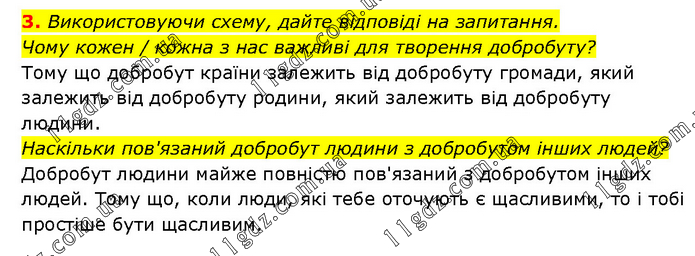 3. Використовуючи схему, дайте відповіді на запитання. Чому кожен / кожна з нас важливі для творення добробуту? Тому що добробут країни залежить від добробуту громади, який залежить від добробуту родини, який залежить від добробуту людини. Наскільки пов'язаний добробут людини з добробутом інших людей? Добробут людини майже повністю пов'язаний з добробутом інших людей. Тому що, коли люди, які тебе оточують є щасливими, то і тобі простіше бути щасливим.