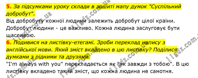 5. За підсумками уроку склади в зошиті мапу думок "Суспільний добробут". Від добробуту кожної людини залежить добробут цілої країни. Добробут людини - це важливо. Кожна людина заслуговує бути щасливою. 6. Подивися на листівку-етегамі. Зроби переклад напису з англійської мови. Який зміст вкладено в цю листівку? Поділися думками з рідними та друзями. "I'm always with you" перекладається як "як завжди з тобою". В цю листівку вкладено такий зміст, що кожна людина не самотня.