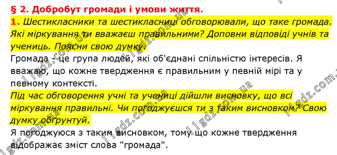 § 2. Добробут громади і умови життя. 1. Шестикласники та шестикласниці обговорювали, що таке громада. Які міркування ти вважаєш правильними? Доповни відповіді учнів та учениць. Поясни свою думку. Громада - це група людей, які об'єднані спільністю інтересів. Я вважаю, що кожне твердження є правильним у певній мірі та у певному контексті. Під час обговорення учні та учениці дійшли висновку, що всі міркування правильні. Чи погоджуєшся ти з таким висновком? Свою думку обґрунтуй. Я погоджуюся з таким висновком, тому що кожне твердження відображає зміст слова "громада".