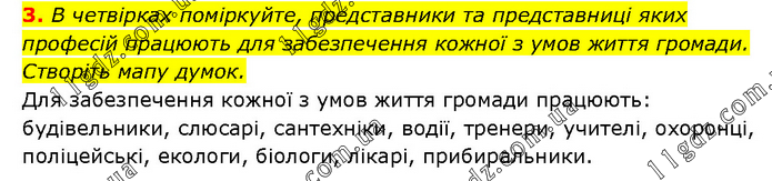 3. В четвірках поміркуйте, представники та представниці яких професій працюють для забезпечення кожної з умов життя громади. Створіть мапу думок. Для забезпечення кожної з умов життя громади працюють: будівельники, слюсарі, сантехніки, водії, тренери, учителі, охоронці, поліцейські, екологи, біологи, лікарі, прибиральники.