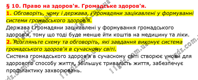§ 10. Право на здоров'я. Громадське здоров'я. 1. Обговоріть, чому і держава, і громадяни зацікавлені у формуванні системи громадського здоров'я. Держава і громадяни зацікавлені у формування громадського здоров'я, тому що тоді буде менше йти коштів на медицину та ліки. 2. Розгляньте схему та обговоріть, які завдання виконує система громадського здоров'я в сучасному світі. Система громадського здоров'я в сучасному світі створює умови для здорового способу життя, збільшує тривалість життя, забезпечує профілактику захворювань.
