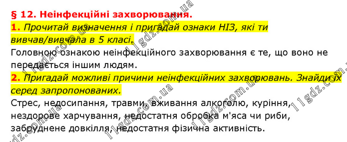 § 12. Неінфекційні захворювання. 1. Прочитай визначення і пригадай ознаки НІЗ, які ти вивчав/вивчала в 5 класі. Головною ознакою неінфекційного захворювання є те, що воно не передається іншим людям. 2. Пригадай можливі причини неінфекційних захворювань. Знайди їх серед запропонованих. Стрес, недосипання, травми, вживання алкоголю, куріння, нездорове харчування, недостатня обробка м'яса чи риби, забруднене довкілля, недостатня фізична активність.