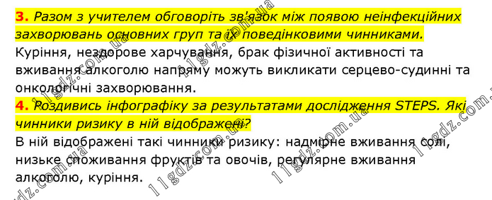 3. Разом з учителем обговоріть зв'язок між появою неінфекційних захворювань основних груп та їх поведінковими чинниками. Куріння, нездорове харчування, брак фізичної активності та вживання алкоголю напряму можуть викликати серцево-судинні та онкологічні захворювання. 4. Роздивись інфографіку за результатами дослідження STEPS. Які чинники ризику в ній відображені? В ній відображені такі чинники ризику: надмірне вживання солі, низьке споживання фруктів та овочів, регулярне вживання алкоголю, куріння.