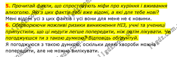 5. Прочитай факти, що спростовують міфи про куріння і вживання алкоголю. Які з цих фактів тобі вже відомі, а які для тебе нові? Мені відомі усі з цих фактів і усі вони для мене не є новими. 6. Обговорюючи можливі ризики виникнення НІЗ, учні та учениці припустили, що ці недуги легше попередити, ніж потім лікувати. Чи погоджуєшся ти з такою думкою? Відповідь обґрунтуй. Я погоджуюся з такою думкою, оскільки деякі хвороби можна попередити, але не можна вилікувати.