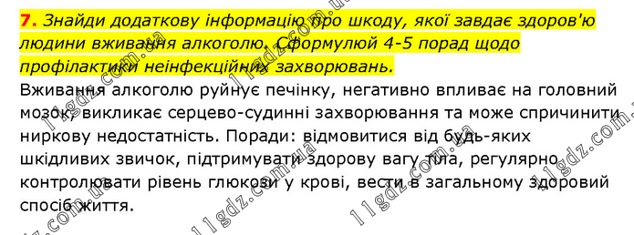 Знайди додаткову інформацію про шкоду, якої завдає здоров'ю людини вживання алкоголю. Сформулюй 4-5 порад щодо профілактики неінфекційних захворювань. Вживання алкоголю руйнує печінку, негативно впливає на головний мозок, викликає серцево-судинні захворювання та може спричинити ниркову недостатність. Поради: відмовитися від будь-яких шкідливих звичок, підтримувати здорову вагу тіла, регулярно контролювати рівень глюкози у крові, вести в загальному здоровий спосіб життя.
