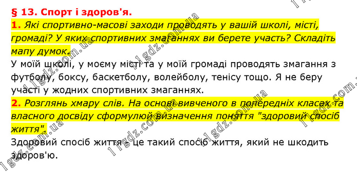 § 13. Спорт і здоров'я. 1. Які спортивно-масові заходи проводять у вашій школі, місті, громаді? У яких спортивних змаганнях ви берете участь? Складіть мапу думок. У моїй школі, у моєму місті та у моїй громаді проводять змагання з футболу, боксу, баскетболу, волейболу, тенісу тощо. Я не беру участі у жодних спортивних змаганнях. 2. Розглянь хмару слів. На основі вивченого в попередніх класах та власного досвіду сформулюй визначення поняття "здоровий спосіб життя". Здоровий спосіб життя - це такий спосіб життя, який не шкодить здоров'ю.
