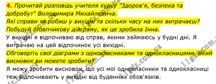4. Прочитай розповідь учителя курсу "Здоров'я, безпека та добробут" Володимира Михайловича. Які справи ти робиш у вихідні та скільки часу на них витрачаєш? Побудуй стовпчикову діаграму, як це зробила Інна. У вихідні я відпочиваю від справ, якими займаюсь у будні дні. Я витрачаю на цей відпочинок усі вихідні. Обговоріть свої діаграми з однокласниками та однокласницями. Який висновок ви можете зробити? Я можу зробити висновок, що усі мої однокласники та однокласниці теж відпочивають у вихідні від буденних обов'язків.