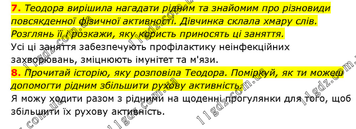 7. Теодора вирішила нагадати рідним та знайомим про різновиди повсякденної фізичної активності. Дівчинка склала хмару слів. Розглянь її і розкажи, яку користь приносять ці заняття. Усі ці заняття забезпечують профілактику неінфекційних захворювань, зміцнюють імунітет та м'язи. 8. Прочитай історію, яку розповіла Теодора. Поміркуй, як ти можеш допомогти рідним збільшити рухову активність. Я можу ходити разом з рідними на щоденні прогулянки для того, щоб збільшити їх рухову активність.