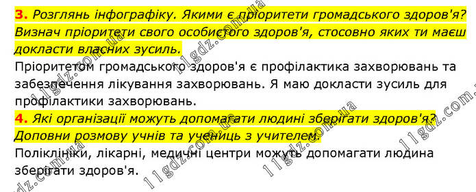3. Розглянь інфографіку. Якими є пріоритети громадського здоров'я? Визнач пріоритети свого особистого здоров'я, стосовно яких ти маєш докласти власних зусиль. Пріоритетом громадського здоров'я є профілактика захворювань та забезпечення лікування захворювань. Я маю докласти зусиль для профілактики захворювань. 4. Які організації можуть допомагати людині зберігати здоров'я? Доповни розмову учнів та учениць з учителем. Поліклініки, лікарні, медичні центри можуть допомагати людина зберігати здоров'я.