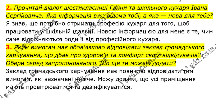 2. Прочитай діалог шестикласниці Ганни та шкільного кухаря Івана Сергійовича. Яка інформація вже відома тобі, а яка — нова для тебе? Я знав, що потрібно отримати професію кухаря для того, щоб працювати у шкільній їдальні. Новою інформацією для мене є те, чим саме відрізняються родичі від професійного кухаря. 3. Яким вимогам має обов'язково відповідати заклад громадського харчування, що дбає про здоров'я та комфорт своїх відвідувачів? Обери серед запропонованого. Що ще ти можеш додати? Заклад громадського харчування має повністю відповідати тим вимогам, які зазначені нижче. Можу додати, що усі приміщення мають провітрюватися та дезінфікуватися.