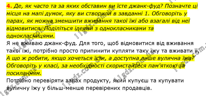 4. Де, як часто та за яких обставин ви їсте джанк-фуд? Позначте ці місця на мапі думок, яку ви створили в завданні 1. Обговоріть у парах, як можна зменшити вживання такої їжі або взагалі від неї відмовитися. Поділіться ідеями з однокласниками та однокласницями. Я не вживаю джанк-фуд. Для того, щоб відмовитися від вживання такої їжі, потрібно просто припинити купляти таку їжу та вживати її. А що ж робити, якщо хочеться їсти, а доступна лише вулична їжа? Обговоріть у класі, за необхідності скористайтеся пам'яткою за посиланням. Потрібно перевіряти запах продукту, який купуєш та купувати вуличну їжу у більш-менше перевірених продавців.