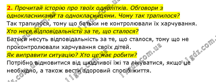 2. Прочитай історію про твоїх однолітків. Обговори з однокласниками та однокласницями. Чому так трапилося? Так трапилося, тому що батьки не контролювали їх харчування. Хто несе відповідальність за те, що сталося? Батьки несуть відповідальність за те, що сталося, тому що не проконтролювали харчування своїх дітей. Як виправити ситуацію? Хто це має робити? Потрібно відмовитися від шкідливої їжі та лікуватися, якщо це необхідно, а також вести здоровий спосіб життя.
