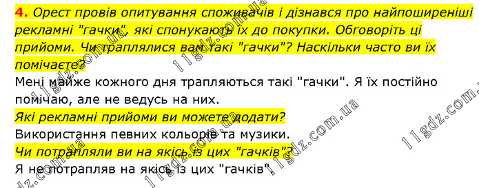 Орест провів опитування споживачів і дізнався про найпоширеніші рекламні "гачки", які спонукають їх до покупки. Обговоріть ці прийоми. Чи траплялися вам такі "гачки"? Наскільки часто ви їх помічаєте? Мені майже кожного дня трапляються такі "гачки". Я їх постійно помічаю, але не ведусь на них. Які рекламні прийоми ви можете додати? Використання певних кольорів та музики. Чи потрапляли ви на якісь із цих "гачків"? Я не потрапляв на якісь із цих "гачків".