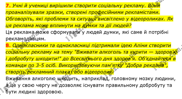 7. Учні й учениці вирішили створити соціальну рекламу. Вони проаналізували зразки, створені професійними рекламістами. Обговоріть, які проблеми та ситуації висвітлено у відеороликах. Як ця реклама може вплинути на думки та дії людей? Ця реклама може сформувати у людей думки, які саме й потрібні рекламодавцям. 8. Однокласники та однокласниці підтримали ідею Аліни створити соціальну рекламу на тему "Вживати алкоголь та курити — здоров'ю і добробуту шкодити!" до Всесвітнього дня здоров'я. Об'єднайтеся в команди по 3-5 осіб. Використовуючи пам'ятку "Добра реклама", створіть рекламний плакат або відеоролик. Вживання алкоголю шкодить, наприклад, головному мозку людини, а це у свою чергу не дозволяє існувати правильному добробуту та бути людині здоровою.