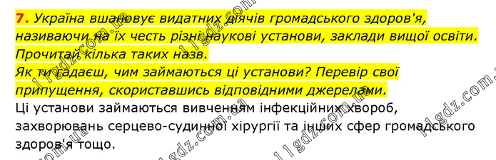 Україна вшановує видатних діячів громадського здоров'я, називаючи на їх честь різні наукові установи, заклади вищої освіти. Прочитай кілька таких назв. Як ти гадаєш, чим займаються ці установи? Перевір свої припущення, скориставшись відповідними джерелами. Ці установи займаються вивченням інфекційних хвороб, захворювань серцево-судинної хірургії та інших сфер громадського здоров'я тощо.