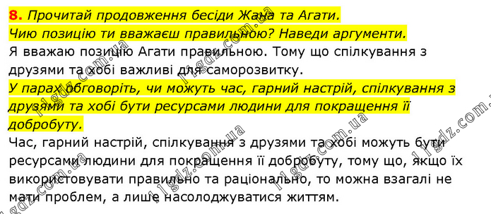 Прочитай продовження бесіди Жана та Агати. Чию позицію ти вважаєш правильною? Наведи аргументи. Я вважаю позицію Агати правильною. Тому що спілкування з друзями та хобі важливі для саморозвитку. У парах обговоріть, чи можуть час, гарний настрій, спілкування з друзями та хобі бути ресурсами людини для покращення її добробуту. Час, гарний настрій, спілкування з друзями та хобі можуть бути ресурсами людини для покращення її добробуту, тому що, якщо їх використовувати правильно та раціонально, то можна взагалі не мати проблем, а лише насолоджуватися життям.