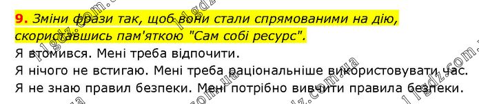 Зміни фрази так, щоб вони стали спрямованими на дію, скориставшись пам'яткою "Сам собі ресурс". Я втомився. Мені треба відпочити. Я нічого не встигаю. Мені треба раціональніше використовувати час. Я не знаю правил безпеки. Мені потрібно вивчити правила безпеки.
