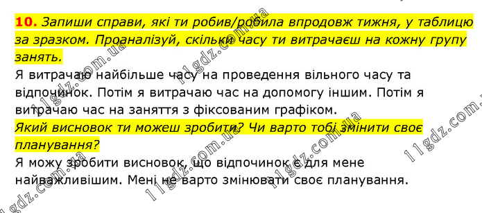 Запиши справи, які ти робив/робила впродовж тижня, у таблицю за зразком. Проаналізуй, скільки часу ти витрачаєш на кожну групу занять. Я витрачаю найбільше часу на проведення вільного часу та відпочинок. Потім я витрачаю час на допомогу іншим. Потім я витрачаю час на заняття з фіксованим графіком. Який висновок ти можеш зробити? Чи варто тобі змінити своє планування? Я можу зробити висновок, що відпочинок є для мене найважливішим. Мені не варто змінювати своє планування.