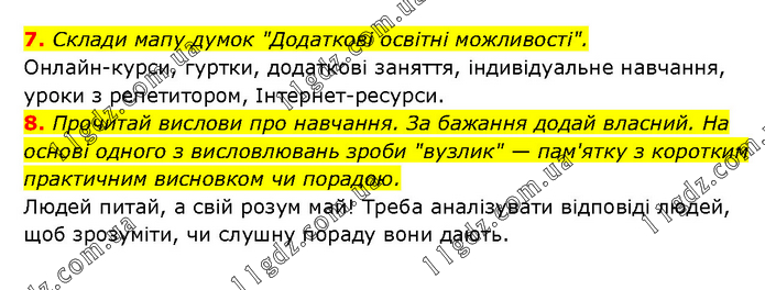 7. Склади мапу думок "Додаткові освітні можливості". Онлайн-курси, гуртки, додаткові заняття, індивідуальне навчання, уроки з репетитором, Інтернет-ресурси. 8. Прочитай вислови про навчання. За бажання додай власний. На основі одного з висловлювань зроби "вузлик" — пам'ятку з коротким практичним висновком чи порадою. Людей питай, а свій розум май! Треба аналізувати відповіді людей, щоб зрозуміти, чи слушну пораду вони дають.