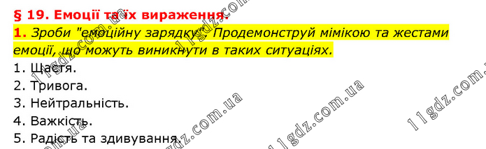 § 19. Емоції та їх вираження. 1. Зроби "емоційну зарядку". Продемонструй мімікою та жестами емоції, що можуть виникнути в таких ситуаціях. 1. Щастя. 2. Тривога. 3. Нейтральність. 4. Важкість. 5. Радість та здивування.
