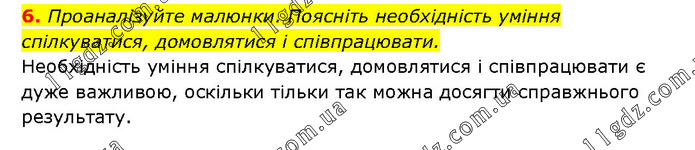 Проаналізуйте малюнки. Поясніть необхідність уміння спілкуватися, домовлятися і співпрацювати. Необхідність уміння спілкуватися, домовлятися і співпрацювати є дуже важливою, оскільки тільки так можна досягти справжнього результату.