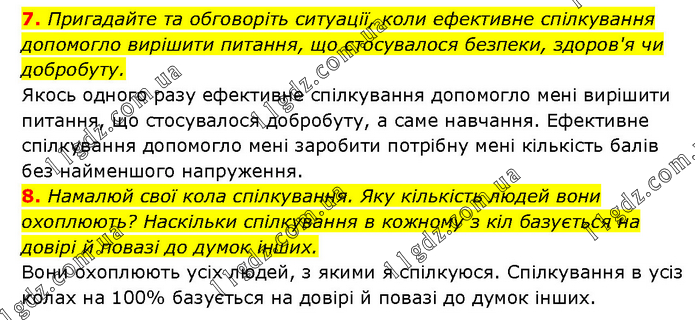 7. Пригадайте та обговоріть ситуації, коли ефективне спілкування допомогло вирішити питання, що стосувалося безпеки, здоров'я чи добробуту. Якось одного разу ефективне спілкування допомогло мені вирішити питання, що стосувалося добробуту, а саме навчання. Ефективне спілкування допомогло мені заробити потрібну мені кількість балів без найменшого напруження. 8. Намалюй свої кола спілкування. Яку кількість людей вони охоплюють? Наскільки спілкування в кожному з кіл базується на довірі й повазі до думок інших. Вони охоплюють усіх людей, з якими я спілкуюся. Спілкування в усіз колах на 100% базується на довірі й повазі до думок інших.