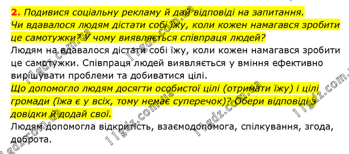 2. Подивися соціальну рекламу й дай відповіді на запитання. Чи вдавалося людям дістати собі їжу, коли кожен намагався зробити це самотужки? У чому виявляється співпраця людей? Людям на вдавалося дістати собі їжу, коли кожен намагався зробити це самотужки. Співпраця людей виявляється у вміння ефективно вирішувати проблеми та добиватися цілі. Що допомогло людям досягти особистої цілі (отримати їжу) і цілі громади (їжа є у всіх, тому немає суперечок)? Обери відповіді з довідки й додай свої. Людям допомогла відкритість, взаємодопомога, спілкування, згода, доброта.