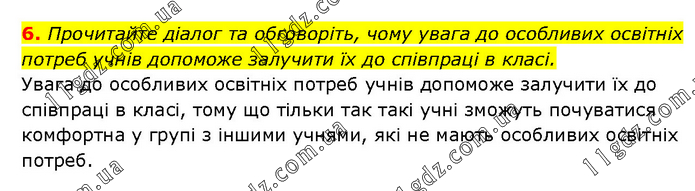 Прочитайте діалог та обговоріть, чому увага до особливих освітніх потреб учнів допоможе залучити їх до співпраці в класі. Увага до особливих освітніх потреб учнів допоможе залучити їх до співпраці в класі, тому що тільки так такі учні зможуть почуватися комфортна у групі з іншими учнями, які не мають особливих освітніх потреб.