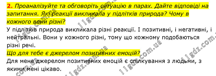 Проаналізуйте та обговоріть ситуацію в парах. Дайте відповіді на запитання. Які реакції викликала у підлітків природа? Чому в кожного вони різні? У підлітків природа викликала різні реакції. І позитивні, і негативні, і нейтральні. Вони у кожного різні, тому що кожному подобаються різні речі. Що для тебе є джерелом позитивних емоцій? Для мене джерелом позитивних емоцій є спілкування з людьми, з якими мені цікаво.