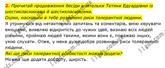 2. Прочитай продовження бесіди вчительки Тетяни Едуардівни із шестикласниками й шестикласницями. Оціни, наскільки в тебе розвинені риси толерантної людини. Я утримуюся від нетактовних запитань та коментарів, вмію керувати емоціями, виявляю відкритість до чужих ідей, визнаю всіх людей рівними, приймаю людей такими, якими вони є, поважаю інших, умію слухати. Отже, у мене дуже добре розвинені риси толерантної людини. Які ще риси толерантної особистості можна додати? Можна іще додати доброту, щирість.