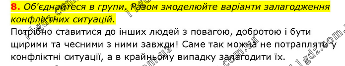 Об'єднайтеся в групи. Разом змоделюйте варіанти залагодження конфліктних ситуацій. Потрібно ставитися до інших людей з повагою, добротою і бути щирими та чесними з ними завжди! Саме так можна не потрапляти у конфліктні ситуації, а в крайньому випадку залагодити їх.