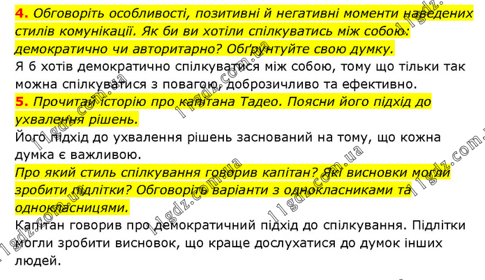 4. Обговоріть особливості, позитивні й негативні моменти наведених стилів комунікації. Як би ви хотіли спілкуватись між собою: демократично чи авторитарно? Обґрунтуйте свою думку. Я б хотів демократично спілкуватися між собою, тому що тільки так можна спілкуватися з повагою, доброзичливо та ефективно. 5. Прочитай історію про капітана Тадео. Поясни його підхід до ухвалення рішень. Його підхід до ухвалення рішень заснований на тому, що кожна думка є важливою. Про який стиль спілкування говорив капітан? Які висновки могли зробити підлітки? Обговоріть варіанти з однокласниками та однокласницями. Капітан говорив про демократичний підхід до спілкування. Підлітки могли зробити висновок, що краще дослухатися до думок інших людей.