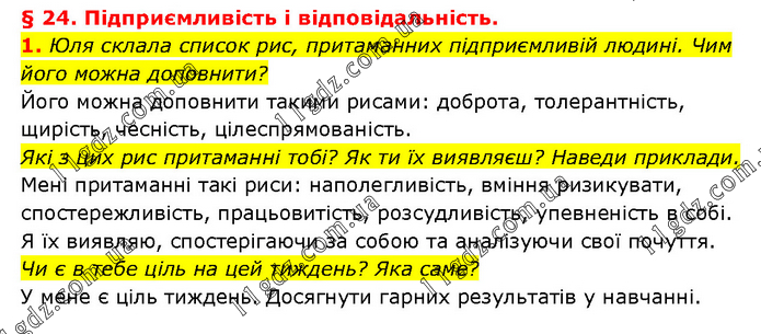 § 24. Підприємливість і відповідальність. 1. Юля склала список рис, притаманних підприємливій людині. Чим його можна доповнити? Його можна доповнити такими рисами: доброта, толерантність, щирість, чесність, цілеспрямованість. Які з цих рис притаманні тобі? Як ти їх виявляєш? Наведи приклади. Мені притаманні такі риси: наполегливість, вміння ризикувати, спостережливість, працьовитість, розсудливість, упевненість в собі. Я їх виявляю, спостерігаючи за собою та аналізуючи свої почуття. Чи є в тебе ціль на цей тиждень? Яка саме? У мене є ціль тиждень. Досягнути гарних результатів у навчанні.