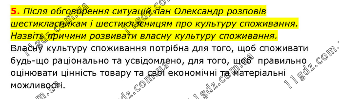Після обговорення ситуацій пан Олександр розповів шестикласникам і шестикласницям про культуру споживання. Назвіть причини розвивати власну культуру споживання. Власну культуру споживання потрібна для того, щоб споживати будь-що раціонально та усвідомлено, для того, щоб правильно оцінювати цінність товару та свої економічні та матеріальні можливості.