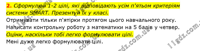 Сформулюй 1-2 цілі, які відповідають усім п'ятьом критеріям системи SMARТ. Презентуй їх у класі. Отримувати тільки п'ятірки протягом цього навчального року. Написати контрольну роботу з математики на 5 балів у четвер. Оціни, наскільки тобі легко формулювати цілі. Мені дуже легко формулювати цілі.