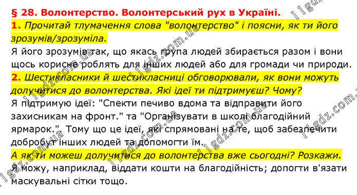 § 28. Волонтерство. Волонтерський рух в Україні. 1. Прочитай тлумачення слова "волонтерство" і поясни, як ти його зрозумів/зрозуміла. Я його зрозумів так, що якась група людей збирається разом і вони щось корисне роблять для інших людей або для громади чи природи. 2. Шестикласники й шестикласниці обговорювали, як вони можуть долучитися до волонтерства. Які ідеї ти підтримуєш? Чому? Я підтримую ідеї: "Спекти печиво вдома та відправити його захисникам на фронт." та "Організувати в школі благодійний ярмарок.". Тому що це ідеї, які спрямовані на те, щоб забезпечити добробут інших людей та допомогти їм. А як ти можеш долучитися до волонтерства вже сьогодні? Розкажи. Я можу, наприклад, віддати кошти на благодійність; допогти в'язати маскувальні сітки тощо.