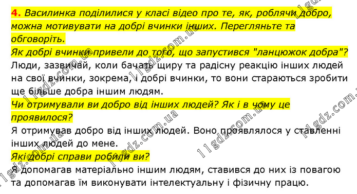 4. Василинка поділилися у класі відео про те, як, роблячи добро, можна мотивувати на добрі вчинки інших. Перегляньте та обговоріть. Як добрі вчинки привели до того, що запустився "ланцюжок добра"? Люди, зазвичай, коли бачать щиру та радісну реакцію інших людей на свої вчинки, зокрема, і добрі вчинки, то вони стараються зробити ще більше добра іншим людям. Чи отримували ви добро від інших людей? Як і в чому це проявилося? Я отримував добро від інших людей. Воно проявлялося у ставленні інших людей до мене. Які добрі справи робили ви? Я допомагав матеріально іншим людям, ставився до них із повагою та допомагав їм виконувати інтелектуальну і фізичну працю.