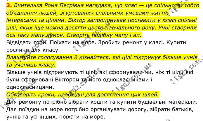 Вчителька Рома Петрівна нагадала, що клас — це спільнота, тобто об'єднання людей, згуртованих спільними умовами життя, інтересами та цілями. Віктор запропонував поставити у класі спільні цілі, яких іще можна досягти цього навчального року. Учні створили ось таку мапу думок. Створіть подібну мапу і ви. Відвідати гори. Поїхати на море. Зробити ремонт у класі. Купити рослини для класу. Влаштуйте голосування й дізнайтеся, які цілі підтримує більше учнів та учениць класу. Більше учнів підтримують ті цілі, які сформували ми, ніж ті цілі, які були сформовані Віктором та його однокласниками і однокласницями. Обговоріть кроки, необхідні для досягнення цих цілей. Для ремонту потрібно зібрати кошти та купити будівельні матеріали. Для поїздки на море потрібно організувати дорогу, зібрати батьків, учнів та усі інших, поїхати на море.