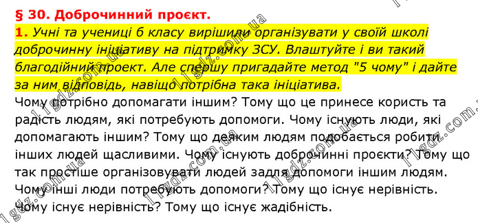 § 30. Доброчинний проєкт. 1. Учні та учениці б класу вирішили організувати у своїй школі доброчинну ініціативу на підтримку ЗСУ. Влаштуйте і ви такий благодійний проект. Але спершу пригадайте метод "5 чому" і дайте за ним відповідь, навіщо потрібна така ініціатива. Чому потрібно допомагати іншим? Тому що це принесе користь та радість людям, які потребують допомоги. Чому існують люди, які допомагають іншим? Тому що деяким людям подобається робити інших людей щасливими. Чому існують доброчинні проєкти? Тому що так простіше організовувати людей задля допомоги іншим людям. Чому інші люди потребують допомоги? Тому що існує нерівність. Чому існує нерівність? Тому що існує жадібність.