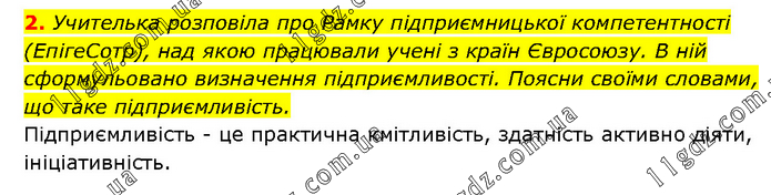 2. Учителька розповіла про Рамку підприємницької компетентності (ЕпігеСотр), над якою працювали учені з країн Євросоюзу. В ній сформульовано визначення підприємливості. Поясни своїми словами, що таке підприємливість. Підприємливість - це практична кмітливість, здатність активно діяти, ініціативність.