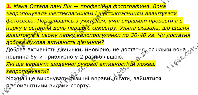 2. Мама Остапа пані Лін — професійна фотографиня. Вона запропонувала шестикласникам і шестикласницям влаштувати фотосесію. Порадившись з учителем, учні вирішили провести її в парку в останній день першого семестру. Уляна сказала, що щодня влаштовує в цьому парку велопрогулянки по 30-40 хв. Чи достатня добова рухова активність дівчинки? Добова активність дівчинки, ймовірно, не достатня, оскільки вона повинна бути приблизно у 2 рази більшою. Які ще варіанти щоденної рухової активності ти можеш запропонувати? Можна іще виконувати фізичні вправи, бігати, займатися різноманітними видами спорту.