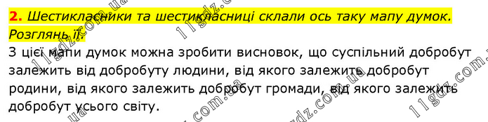 Шестикласники та шестикласниці склали ось таку мапу думок. Розглянь її. З цієї мапи думок можна зробити висновок, що суспільний добробут залежить від добробуту людини, від якого залежить добробут родини, від якого залежить добробут громади, від якого залежить добробут усього світу.