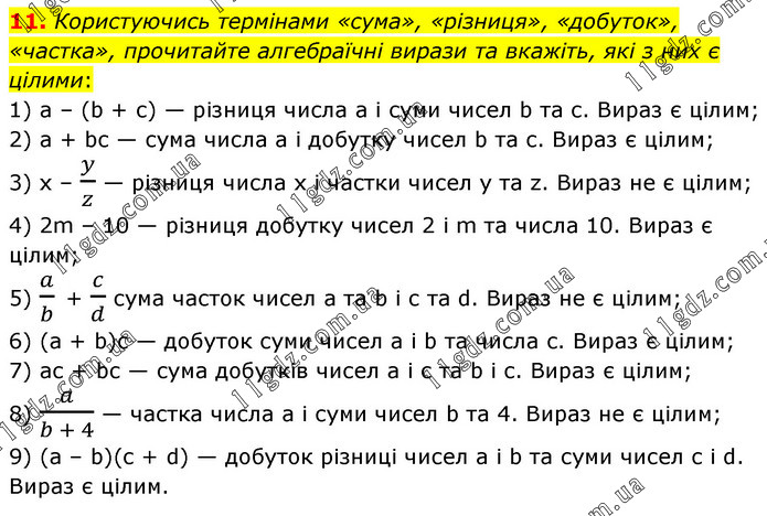 Користуючись термінами «сума», «різниця», «добуток», «частка», прочитайте алгебраїчні вирази та вкажіть, які з них є цілими: 1) а – (b + с) — різниця числа а і суми чисел b та с. Вираз є цілим; 2) а + bс — сума числа а і добутку чисел b та с. Вираз є цілим; 3) х – y/z — різниця числа х і частки чисел у та z. Вираз не є цілим; 4) 2m – 10 — різниця добутку чисел 2 і m та числа 10. Вираз є цілим; 5) a/b + c/d сума часток чисел а та b і с та d. Вираз не є цілим; 6) (а + b)с — добуток суми чисел а і b та числа с. Вираз є цілим; 7) ас + bс — сума добутків чисел а і с та b і с. Вираз є цілим; 8) a/(b + 4) — частка числа а і суми чисел b та 4. Вираз не є цілим; 9) (а – b)(с + d) — добуток різниці чисел а і b та суми чисел с і d. Вираз є цілим.