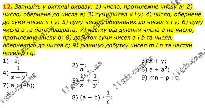 Запишіть у вигляді виразу: 1) число, протилежне числу a; 2) число, обернене до числа a; 3) суму чисел x і y; 4) число, обернене до суми чисел x і y; 5) суму чисел, обернених до чисел x і y; 6) суму числа a та його квадрата; 7) частку від ділення числа a на число, протилежне числу b; 8) добуток суми чисел a і b та числа, оберненого до числа c; 9) різницю добутку чисел m і n та частки чисел p і q. 1) –a; 4) 1/(x + y); 7) a : (–b); 2) 1/a; 5) 1/x + 1/y; 8) (a + b) ∙ 1/c; 3) x + y; 6) a + a2; 9) mn – p : q.