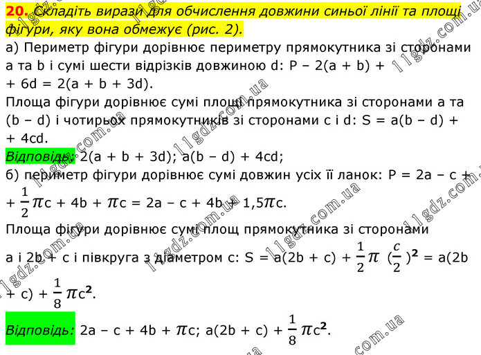 Складіть вирази для обчислення довжини синьої лінії та площі фігури, яку вона обмежує (рис. 2). а) Периметр фігури дорівнює периметру прямокутника зі сторонами а та b і сумі шести відрізків довжиною d: P – 2(а + b) + + 6d = 2(а + b + 3d). Площа фігури дорівнює сумі площі прямокутника зі сторонами а та (b – d) і чотирьох прямокутників зі сторонами с і d: S = a(b – d) + + 4cd. Відповідь: 2(а + b + 3d); a(b – d) + 4cd; б) периметр фігури дорівнює сумі довжин усіх її ланок: Р = 2а – с + + 1/2 πс + 4b + πс = 2а – с + 4b + 1,5πс. Площа фігури дорівнює сумі площ прямокутника зі сторонами а і 2b + с і півкруга з діаметром с: S = а(2b + с) + 1/2 π (c/2 )2 = а(2b + с) + 1/8 πс2. Відповідь: 2а – с + 4b + πс; а(2b + с) + 1/8 πс2.