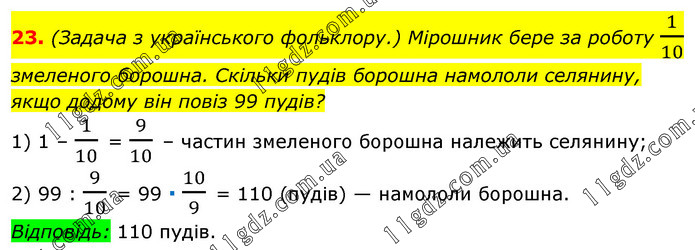 (Задача з українського фольклору.) Мірошник бере за роботу 1/10 змеленого борошна. Скільки пудів борошна намололи селянину, якщо додому він повіз 99 пудів? 1) 1 – 1/10 = 9/10 – частин змеленого борошна належить селянину; 2) 99 : 9/10 = 99 ∙ 10/9 = 110 (пудів) — намололи борошна. Відповідь: 110 пудів.