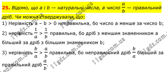 Відомо, що a і b — натуральні числа, а число a/b — правильний дріб. Чи можна стверджувати, що: 1) Нерівність а – b > 0 неправильна, бо число a менше за число b; 2) нерівність 1/a > 1/b правильна, бо дріб з меншим знаменником а більший за дріб з більшим знаменником b; 3) нерівність b/a > a/b правильна, бо неправильний дріб b/a більший за правильний дріб a/b.