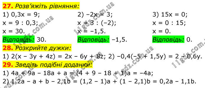 27. Розв’яжіть рівняння: 1) 0,3x = 9; х = 9 : 0,3; х = 30. Відповідь: 30. 2) –2х = 3; х = 3 : (–2); х = –1,5. Відповідь: –1,5. 3) 15х = 0; х = 0 : 15; х = 0. Відповідь: 0. 28. Розкрийте дужки: 1) 2(х – 3у + 4z) = 2х – 6у + 8z; 2) –0,4(–5 + 1,5у) = 2 – 0,6у. 29. Зведіть подібні доданки: 1) 4а + 9a – 18а + а = (4 + 9 – 18 + 1)а = –4a; 2) 1,2a – a + b – 2,1b = (1,2 – 1)а + (1 – 2,1)b = 0,2а – 1,1b.