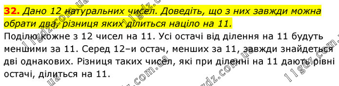 Дано 12 натуральних чисел. Доведіть, що з них завжди можна обрати два, різниця яких ділиться націло на 11. Поділю кожне з 12 чисел на 11. Усі остачі від ділення на 11 будуть меншими за 11. Серед 12–и остач, менших за 11, завжди знайдеться дві однакових. Різниця таких чисел, які при діленні на 11 дають рівні остачі, ділиться на 11.